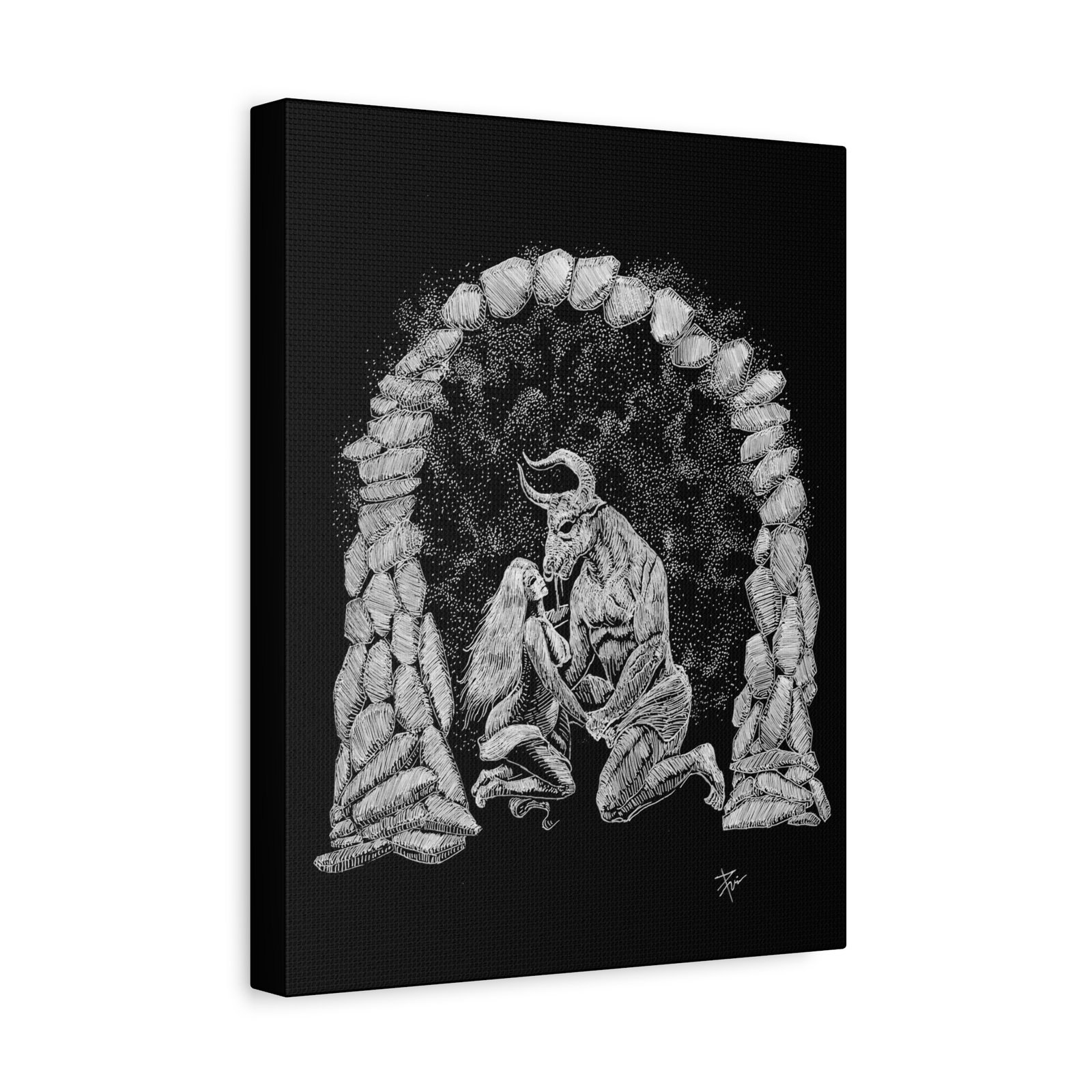 This matte stretched canvas brings a quiet, haunting scene into your space — a tender moment between a cloaked, horned figure and a kneeling companion framed by a rough stone arch. The charcoal-like white-on-black illustration reads like a page from an old folktale: textured strokes, soft edges, and a shadowy background that lets the figures breathe. Hung on a dark hallway wall or above a reading nook, the piece draws viewers in and invites closer inspection. The low-profile 1.25″ depth keeps the image intimate while the soft rubber feet and included hanging hardware make installation neat and secure. Printed with eco-conscious latex inks on a cotton-poly canvas and stretched over renewable pine, it’s made to keep the mood of the artwork alive for years without chemical glare or fading.