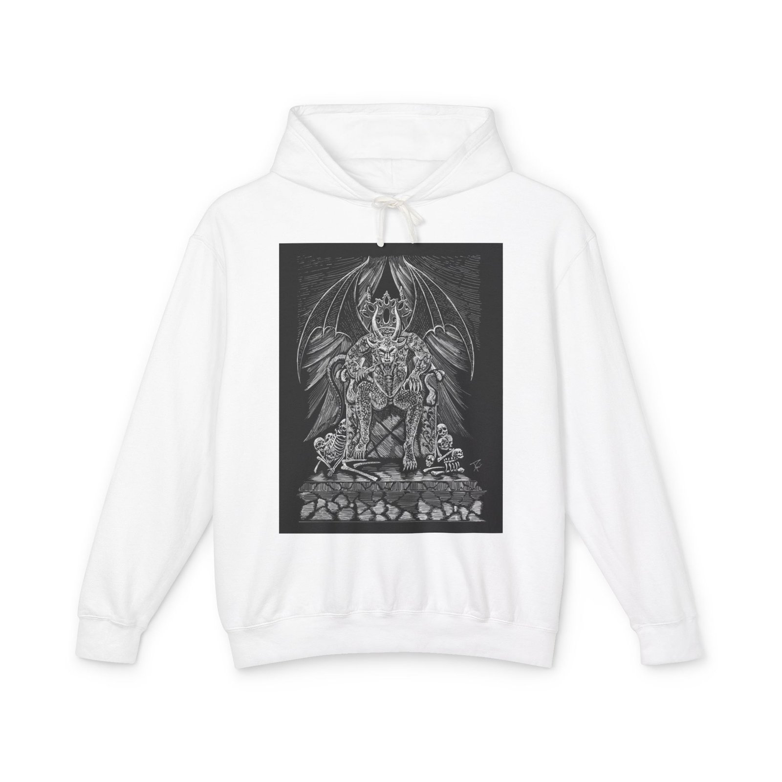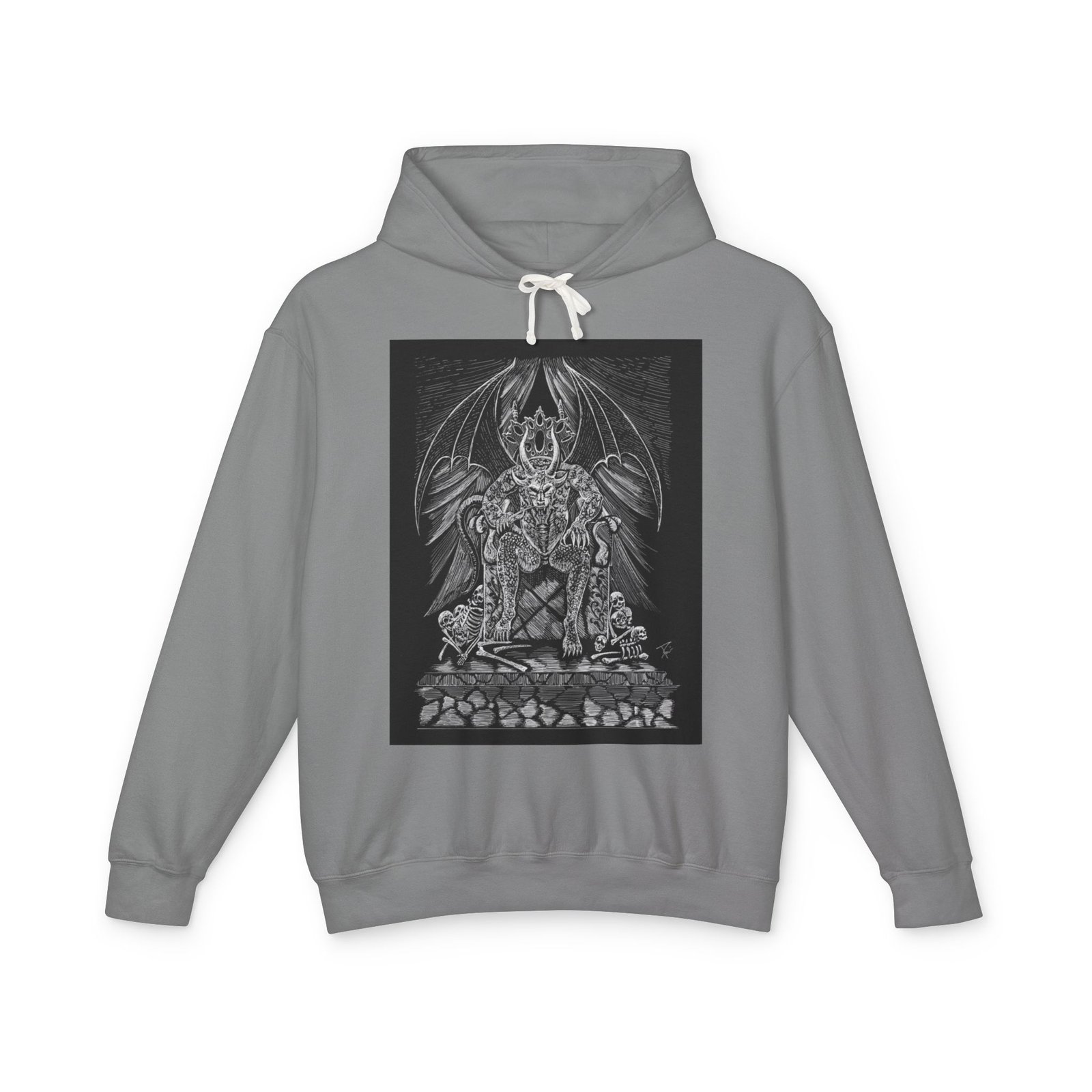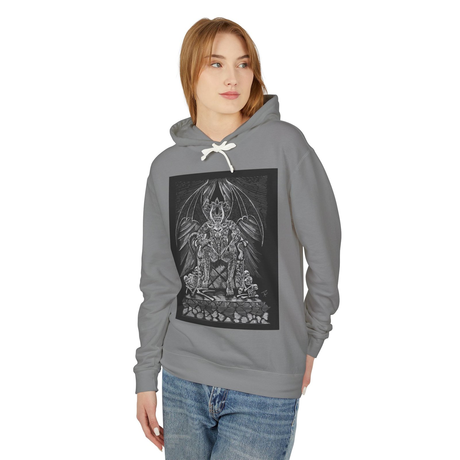 This lightweight hooded sweatshirt carries a dark, detailed illustration that settles like a story on the chest — a shadowy throne, a winged sentinel and weathered stones rendered in fine grayscale lines. It wears like a quiet statement: breathable cotton that moves with you, a softly lined hood with natural flatcord, and a relaxed silhouette that layers easily. Slip it on for late-night walks, art shows, or when you want clothing that feels like an attitude rather than a logo. The hand-feel is soft and true to the print, and thoughtful low-impact dyes plus sustainably sourced cotton mean the piece looks good and aligns with more mindful practices.