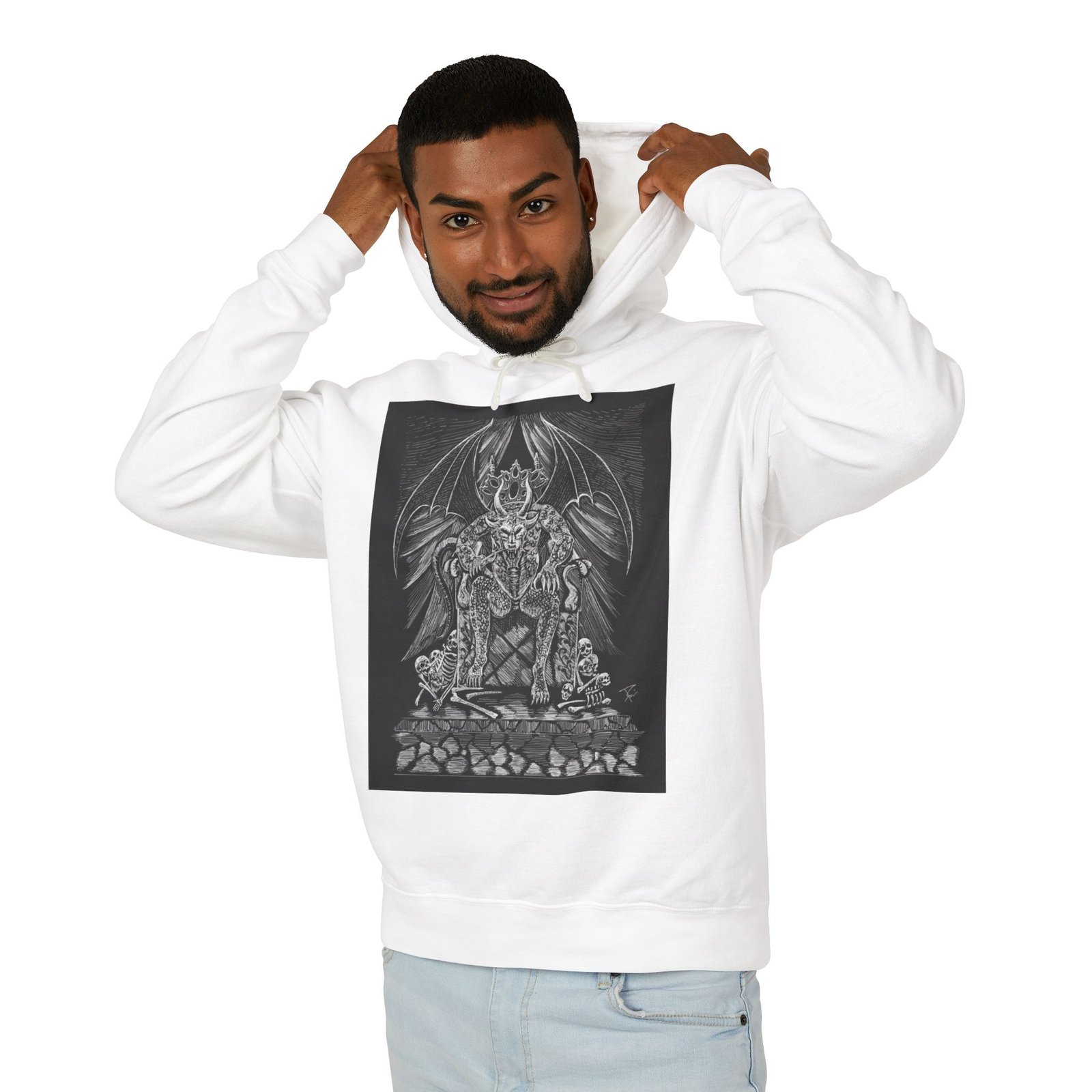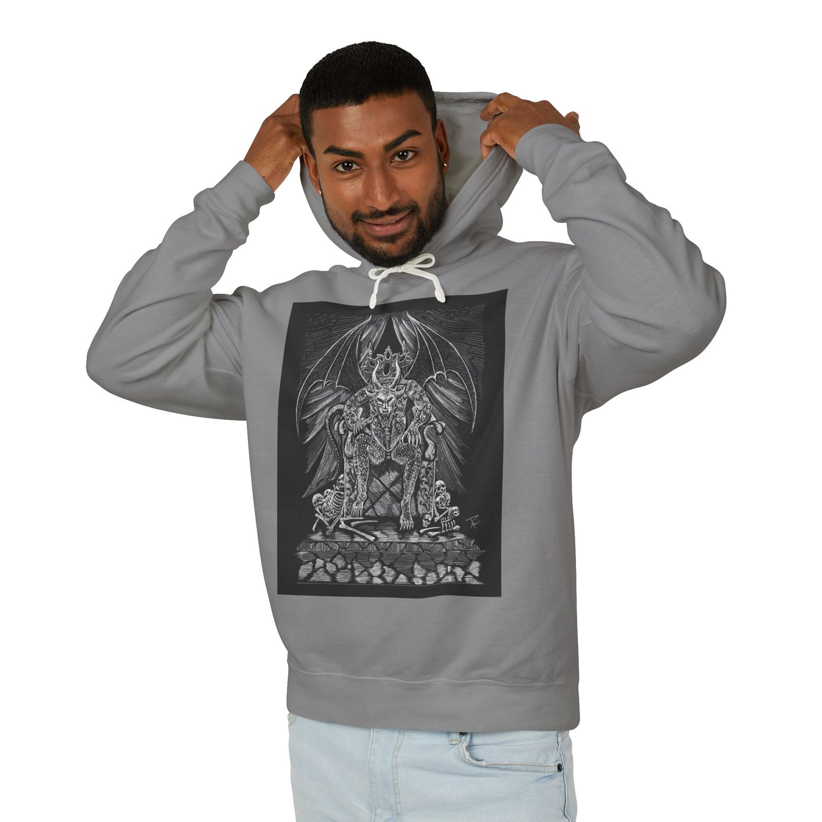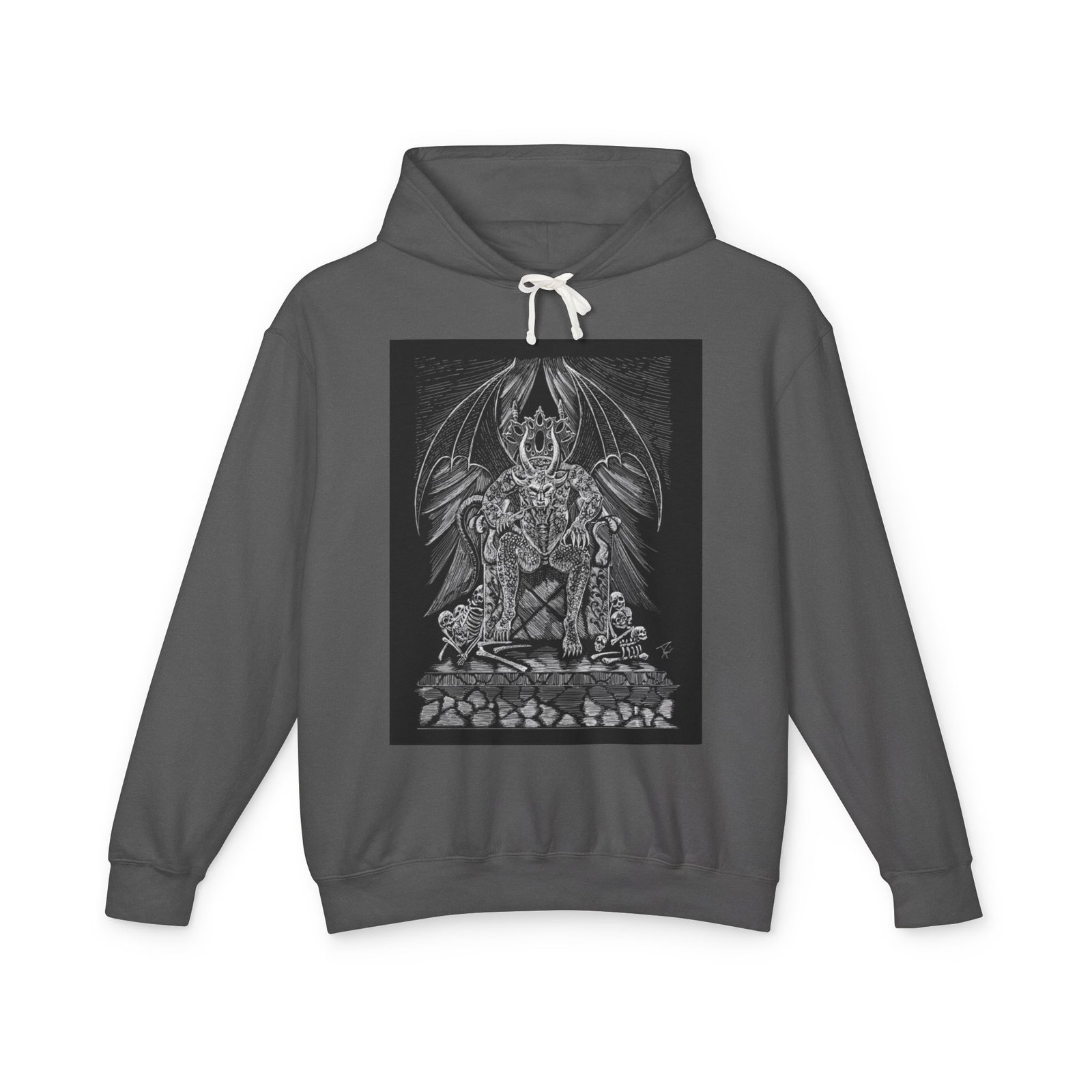 This lightweight hooded sweatshirt carries a dark, detailed illustration that settles like a story on the chest — a shadowy throne, a winged sentinel and weathered stones rendered in fine grayscale lines. It wears like a quiet statement: breathable cotton that moves with you, a softly lined hood with natural flatcord, and a relaxed silhouette that layers easily. Slip it on for late-night walks, art shows, or when you want clothing that feels like an attitude rather than a logo. The hand-feel is soft and true to the print, and thoughtful low-impact dyes plus sustainably sourced cotton mean the piece looks good and aligns with more mindful practices.